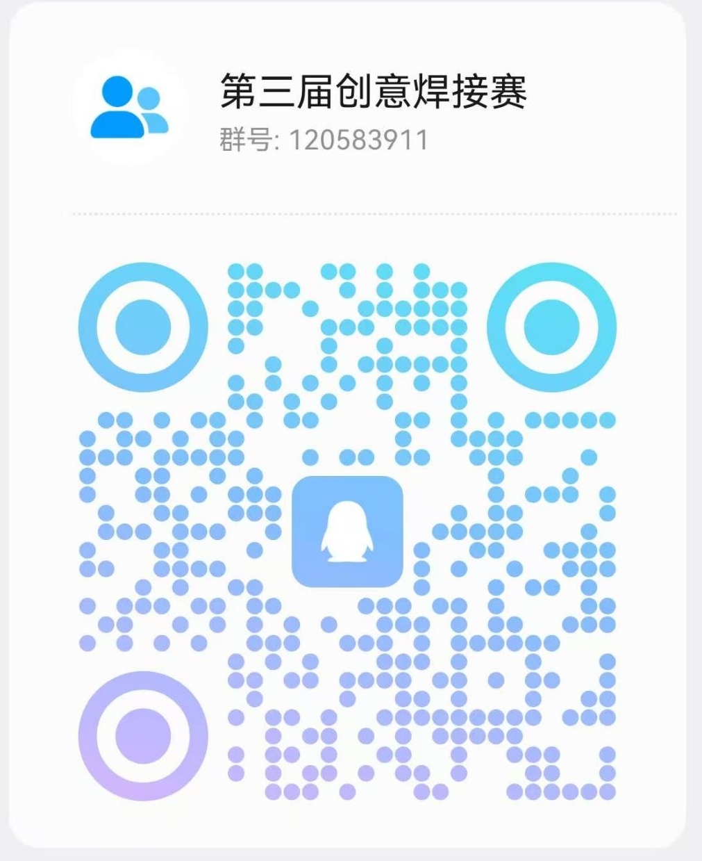 参赛学生必须添加比赛专用QQ群,群号120583911,入群答案:创意焊接赛。入群备注XX级+XX专业+XXX(姓名)。比赛有关事宜将通过QQ群发布,暂定12月19日发布比赛具体题目及要求。有意参赛学生请及时入群,关注群内消息。
