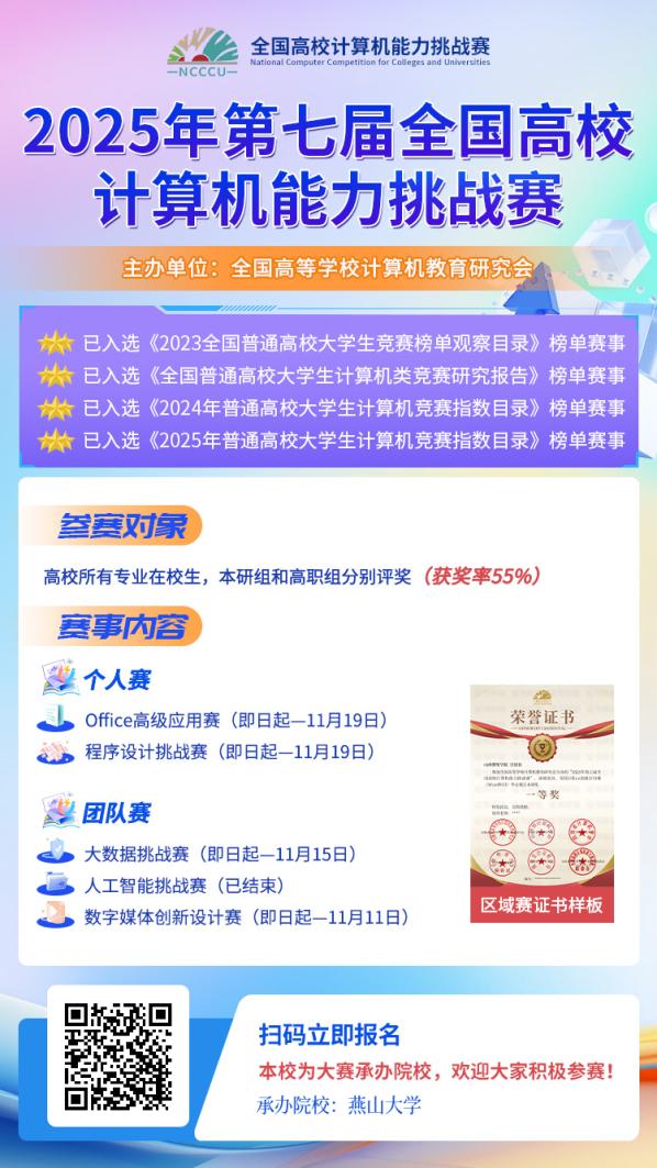 全国高校计算机能力挑战赛(简称“计挑赛”)由全国高等学校计算机教育研究会主办,是学校认定的二类竞赛。计挑赛秉承“以赛促教,以赛促学,以赛促产教融合”的初心,引导在校生学习掌握计算机与互联网知识,提高计算机应用力、解决问题能力以及创新创业能力,为未来求职就业和生活学习打下坚实的技能基础,推动计算机教育教学与产业融合,为培养新时代人才发挥积极作用。现将组织参赛有关事项通知如下: